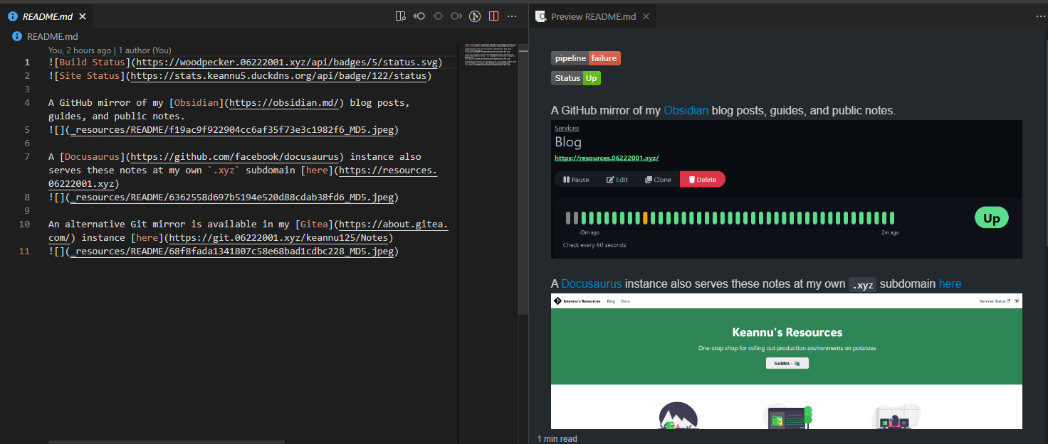 The setup unfortunately required using wiki links rather regular markdown ones. This meant that my GitHub repository for my Obsidian notes would appear broken from the GitHub and Gitea UI.